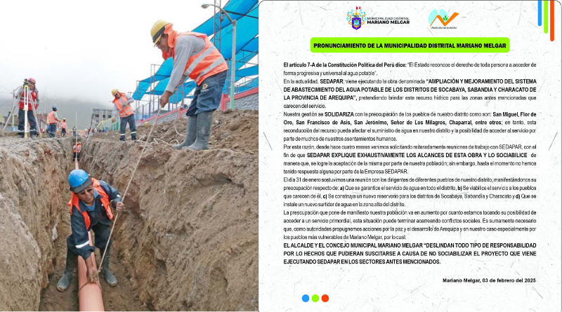 Según la comuna melgariana, desde hace cuatro meses han solicitado a Sedapar información detallada sobre los alcances del proyecto, sin obtener respuesta. Ante esta situación, las autoridades locales exigen que la empresa socialice el proyecto con la comunidad para aclarar si habrá afectaciones y, en caso de ser necesario, plantear soluciones que eviten perjudicar a miles de familias del distrito.