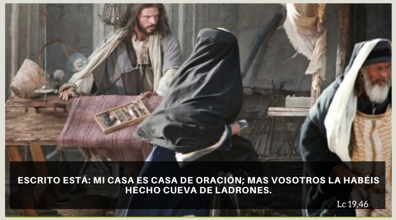 Lc 19,45-48, Jesús lloraba, por Jerusalén, no había reconocido el día de la salvación de Dios. Hoy entra en el Templo, lugar muy querido para él. A los doce años estuvo allí discutiendo con los doctores de la Ley. Se le remueven las entrañas al ver convertida la casa de oración en comercio. “Isaías (Is 56,7) había dicho que el Templo tenía que ser «casa de oración para todos los pueblos». Jeremías (Jr 7,11) se quejaba de que, algunos lo convertían en cueva de ladrones. Jesús une las dos citas en la misma queja. Probablemente el clima de feria de negocios que reinaba en los atrios del Templo, con la venta de animales para los sacrificios y el cambio de monedas para los que venían del extranjero, es lo que él desautorizó, aunque todo ello se hiciera con el consentimiento de las autoridades”. J. ALDAZABAL.ENSÉÑAME TUS CAMINOS 6. Barcelona 1997)
