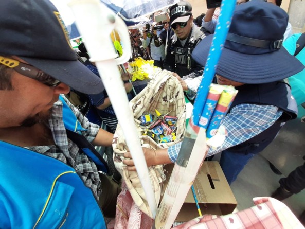 Esta mañana, los efectivos de la Policía Nacional incautaron varios paquetes de pirotécnicos ilegales que fueron trasladados camuflados en 12 cajas de panetón.