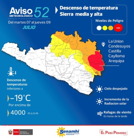El Servicio Nacional de Meteorología e Hidrología SENAMHI, informó que, desde el martes 07 hasta la madrugada del jueves 09 de julio, se registrará el descenso de la temperatura nocturna en la sierra media y alta de la región Arequipa.