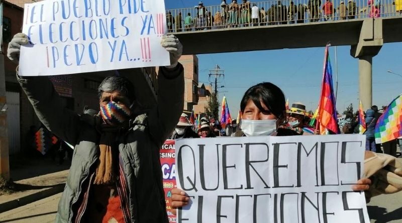 Miles de personas de distintos lugares de Bolivia marcharon este martes en el municipio de El Alto, colindante con La Paz, en contra del aplazamiento de las elecciones dispuesto la semana pasada por el Tribunal Supremo Electoral. Movilizaciones de menor tamaño se realizaron en otras ciudades del país. “Elecciones ya”, “democracia, sí; dictadura, no” y “fuera Áñez” cantaban los manifestantes convocados por la Central Obrera Boliviana y el Pacto de Unidad, la coalición de sindicatos afiliados al Movimiento al Socialismo (MAS), el partido del expresidente Evo Morales