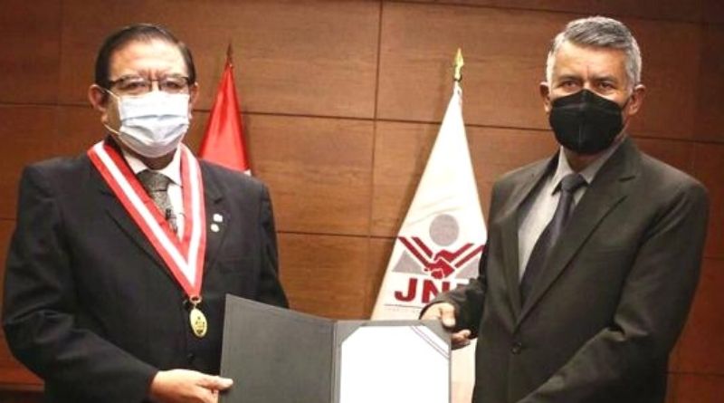 El presidente del Jurado Nacional de Elecciones (JNE),Jorge Luis Salas Arenas, entregó la credencial al general (r) Leonel Cabrera Pino que lo oficializa como congresista por Arequipa.