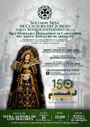 Por ello, el domingo 19 a las 11 horas en la Catedral de Arequipa se celebrará la Misa de Clausura del Jubileo, con la presencia de la imagen de Nuestra Señora de los Dolores, cumpliendo los protocolos de bioseguridad; será una fecha muy significativa para Arequipa, ya que será la primera vez que se viva este acontecimiento en nuestra ciudad.