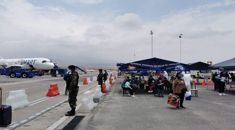 Dos veces por semana, un equipo técnico de la Red Arequipa – Caylloma, se constituyen en el aeropuerto Rodríguez Ballón, verificando el estado de salud de las personas que arriban a nuestra ciudad, quienes a su vez deben presentar la constancia de prueba molecular con resultado negativo aplicada hasta 72 hrs. antes de su viaje y su carnet de vacunación con las dos dosis de vacuna contra el nuevo coronavirus.