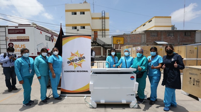 La gobernadora regional de Arequipa, Kimmerlee Gutiérrez Canahuire junto al gerente regional de Salud, Dr. Edilberto Salazar Zender, entregaron 127 congeladoras gestionadas por el Gobierno Regional de Arequipa ante el Ministerio de Salud, para fortalecer el sistema de cadena de frío en los establecimientos de salud del primer nivel de atención.