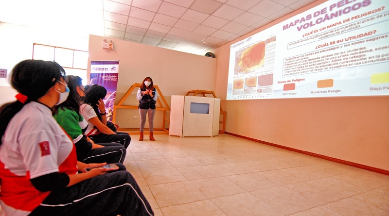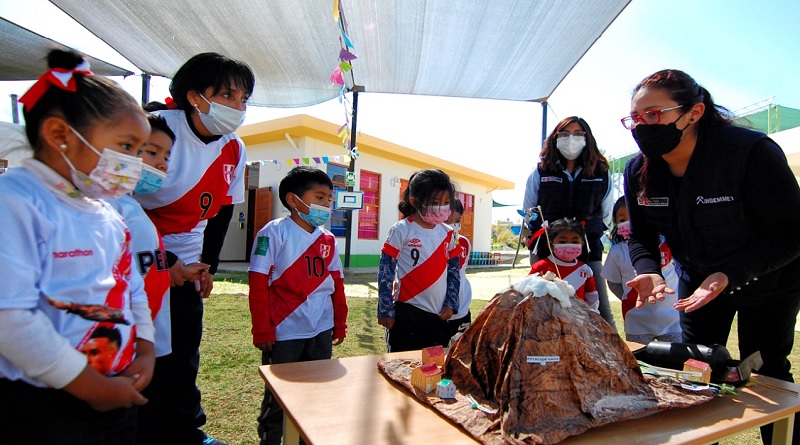 Con el objetivo de contribuir en la preparación de la población frente a los peligros volcánicos, el Instituto Geológico, Minero y Metalúrgico, a través de su observatorio vulcanológico, enseñó, de manera dinámica, a estudiantes de la Institución Educativa Inicial Horacio Zeballos Gámez, del distrito de Socabaya, sobre los peligros a los que se encuentra expuesta la ciudad, por su cercanía con uno de los volcanes más activos, el Misti.