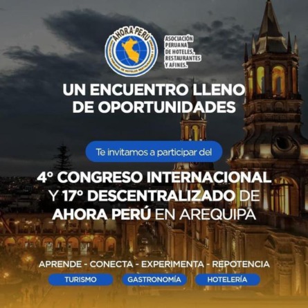 El cuarto Congreso Internacional y 17º Descentralizado de Turismo se celebrará en Arequipa del 17 al 19 de noviembre. El evento es organizado por la Asociación de Hoteles, Restaurantes y Afines (AHORA Perú).