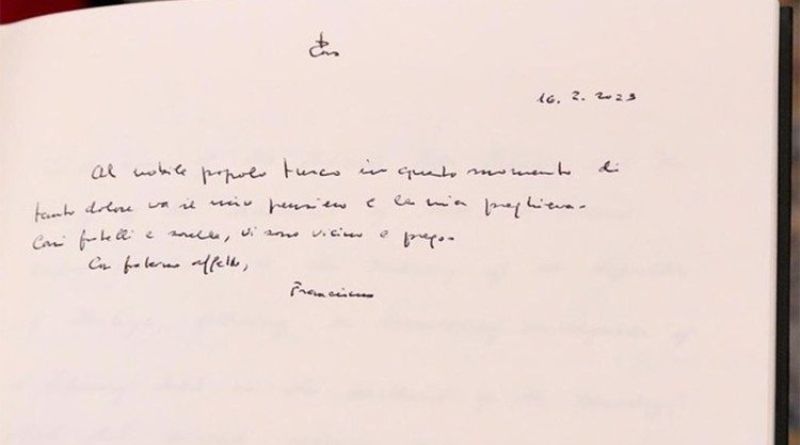 Un nuevo pensamiento, una breve nota con el dolor del Papa por la tragedia del terremoto que sacudió Turquía y Siria el pasado 6 de febrero. «Al noble pueblo turco, en este momento de tanto dolor, va mi pensamiento y mi oración. Queridos hermanos y hermanas, estoy cerca de ustedes y rezo. Con afecto fraterno, Franciscus», dice la nota manuscrita escrita por Francisco esta mañana durante la audiencia concedida al embajador turco Ufuk Ulutaş, recibido para la presentación de las cartas credenciales.