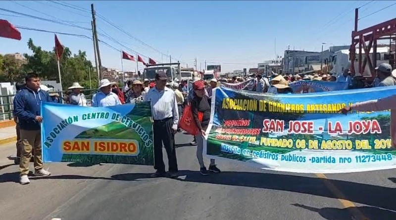 Los pobladores del distrito de La Joya realizan un plantón que impide el paso de transporte por la vía de la Panamericana Sur, a la altura del Cruce La Joya, en protesta por el incumplimiento de promesas de campaña electoral del gobernador Rohel Sánchez, quien habría acordado visitar el distrito hace más de un mes.