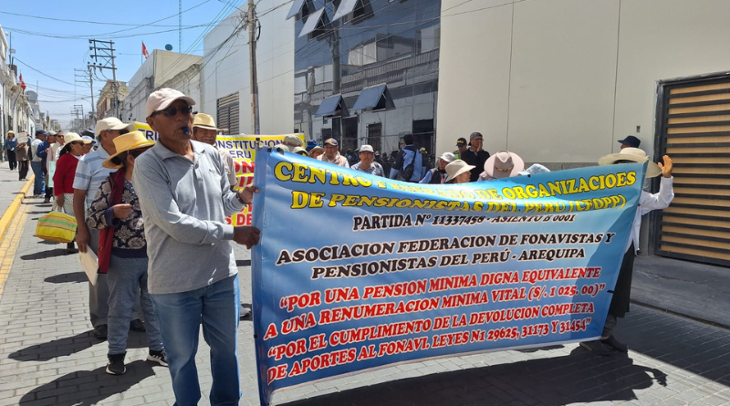 En la ciudad de Arequipa salieron más de 50 jubilados y fonavistas se movilizaron en señal de protesta para exigir el aumento de la pensión al sueldo mínimo, después de aportar más de 20 años a la Oficina de Normalización Previsional (ONP).