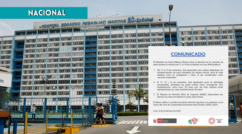 El Ministerio de Salud (Minsa) anunció que, debido a la cumbre APEC, los establecimientos de salud en Lima Metropolitana solo atenderán áreas críticas como emergencias y hospitalización del 14 al 16 de noviembre, mientras que las citas programadas serán reprogramadas.