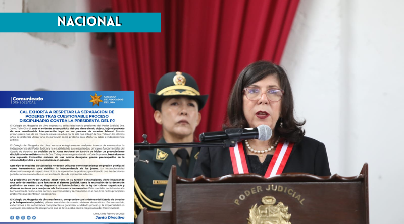 El Colegio de Abogados de Lima, expresó su rechazo al proceso disciplinario inmediato que la Junta Nacional de Justicia, inició contra la presidenta del Poder Judicial, Janet Tello Gilardi . Mediante un comunicado, el gremio alertó que esta medida podría afectar la independencia judicial y calificó la decisión como un acto de presión política que pone en riesgo la separación de poderes.