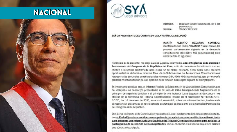 Martín Vizcarra no piensa dar la cara ante el Congreso. El expresidente anunció que no asistirá a la sesión de la Comisión Permanente donde se decidirá su inhabilitación por el cierre del Parlamento en 2019. A través de un comunicado, calificó el proceso como una violación a la «cosa juzgada» y un intento de persecución política.