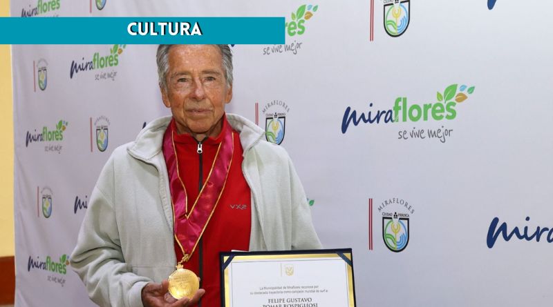 La Municipalidad Distrital de Miraflores distinguió y reconoció la destacada trayectoria deportiva de Felipe Pomar, quien hace 60 años se convirtió en el primer latinoamericano en ganar el campeonato mundial de surf, en la modalidad de tabla hawaiana (1965).