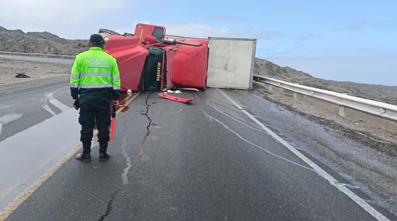 La pesada unidad, perteneciente a la empresa pesquera Pilares S.A.C., partió de Ilo , en la región Moquegua con destino a Chiclayo, afortunadamente, el conductor Fermín Abanto Garcías no requirió atención médica, aunque el vehículo quedó dañado y varado en medio de la vía.