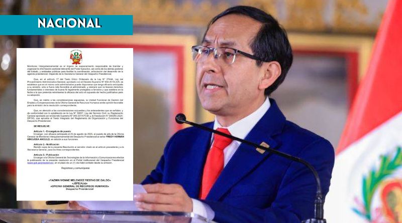 El Despacho Presidencial designó a Fredy Hernán Hinojosa Angulo, exvocero presidencial, como jefe de la Oficina General de Monitoreo Intergubernamental, en reemplazo de Juan José Santiváñez, quien hoy ocupa el cargo de ministro de Justicia y Derechos Humanos, la disposición fue oficializada mediante resolución de la Oficina General de Recursos Humanos y tiene eficacia anticipada desde el 25 de agosto.