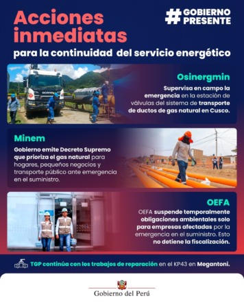El Ejecutivo también anunció un proceso de racionalización del gas natural para priorizar su distribución hacia hogares y sectores considerados esenciales, como servicios de salud, industrias alimentarias, transporte público masivo, telecomunicaciones, sistema financiero y seguridad. Asimismo, el Ministerio de Energía y Minas del Perú aprobará medidas para liberar reservas de combustibles y flexibilizar la mezcla con biocombustibles, con el fin de reforzar el abastecimiento durante la contingencia.