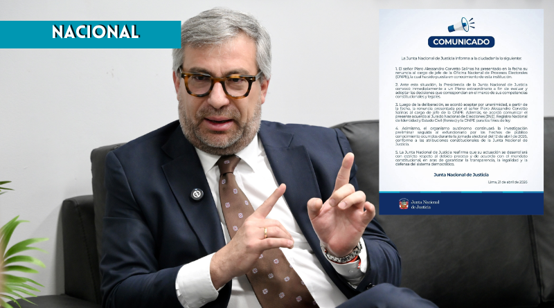 La Junta Nacional de Justicia oficializó la salida de Piero Corvetto Salinas al aceptar por unanimidad su renuncia como jefe de la Oficina Nacional de Procesos Electorales, en medio de la crisis desatada por las fallas durante las elecciones del 12 de abril. La decisión, efectiva de inmediato, cierra una gestión iniciada en agosto de 2020 y marca un punto crítico en la institucionalidad electoral.